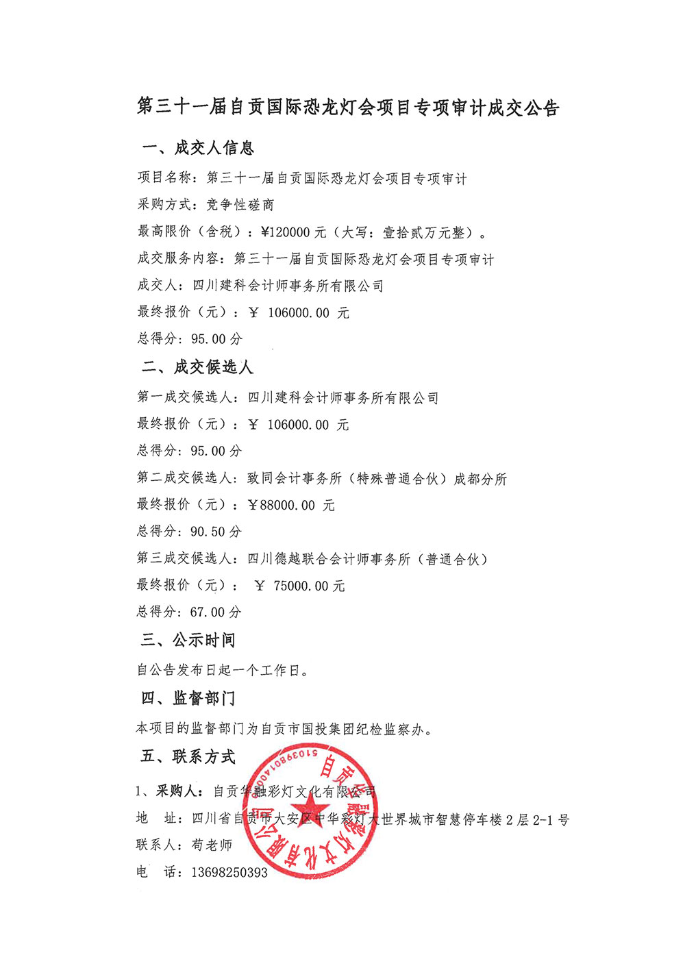 第三十一屆自貢國際恐龍燈會項(xiàng)目專項(xiàng)審計(jì)成交公告